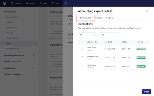 After running payroll in Mangomint, your payroll data will be synced with QuickBooks according to your selected export settings and account mapping. To view payroll data that was synced (or that needs to be manually synced), select Review under Accounting export and select the Transactions tab.