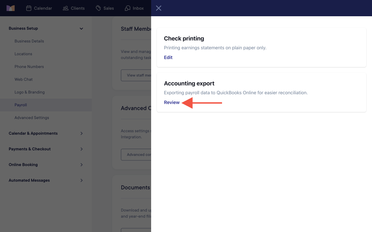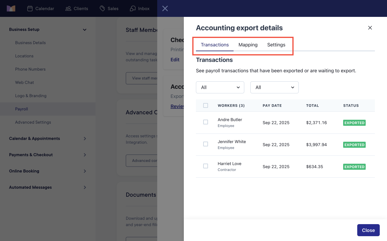 When you run payroll in Mangomint, you can sync your payroll data with QuickBooks Online automatically. This eliminates the need to export payroll data to QuickBooks manually, and it ensures your books stay up to date.