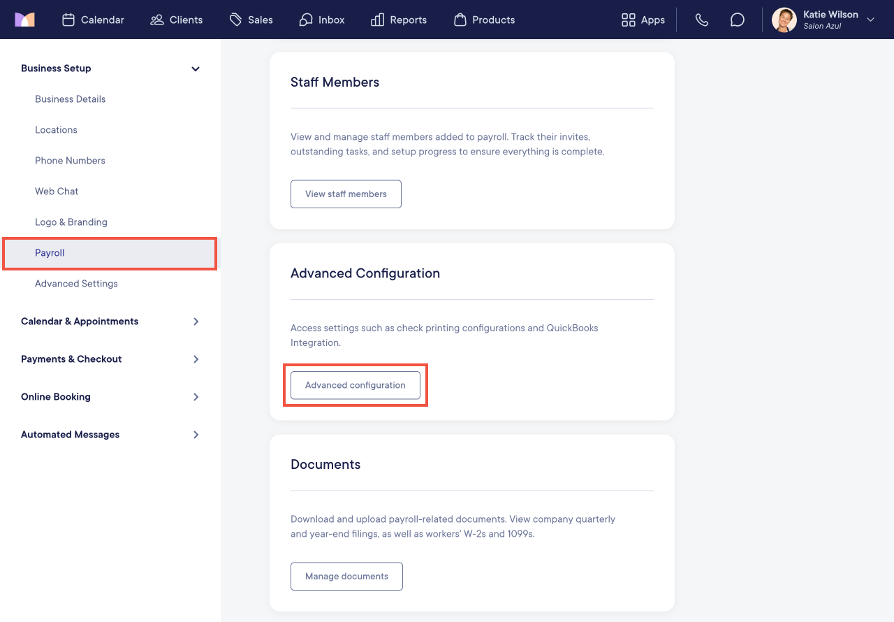 To set up the QuickBooks payroll sync, open the Settings app and go to Business Setup > Payroll > Advanced configuration. If you have multiple payroll accounts, select Manage account > Advanced configuration.