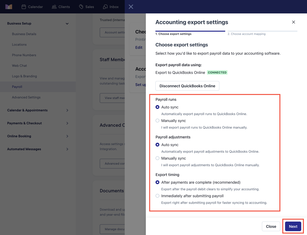 Export timing: Specify when you’d like to sync new payroll runs with QuickBooks. We recommend selecting After payments are complete. This ensures that if you need to cancel or edit a payroll run after it’s submitted, you won’t need to log in to QuickBooks and manually update the data.