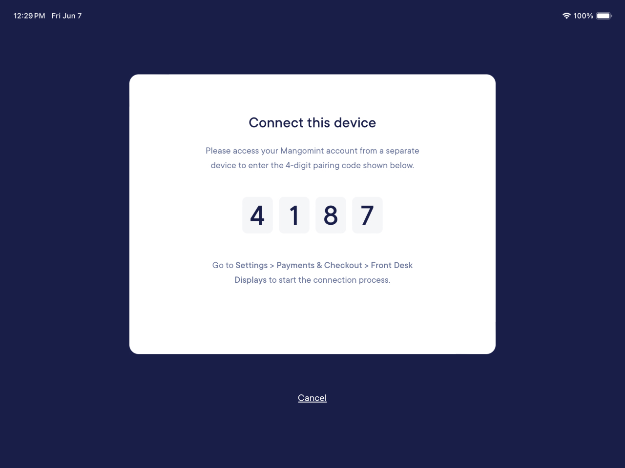 Open the Mangomint app on your iPad and tap Front desk mode. A 4-digit pairing code will be displayed.