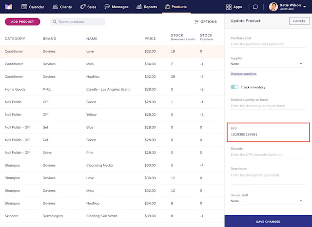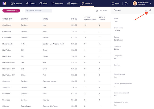 To add SKUs to your products in Mangomint, open the Products app and select a product. Select the pencil icon.