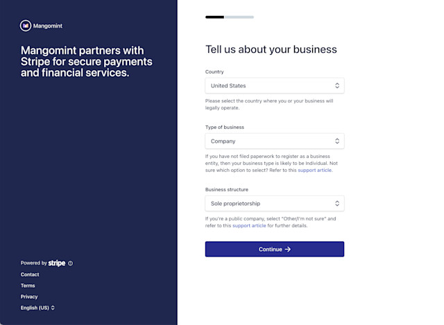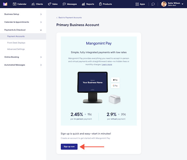 To sign up for payment processing, open the Settings app and go to Payments & Checkout > Payment Accounts > Primary Account to create your payment account.