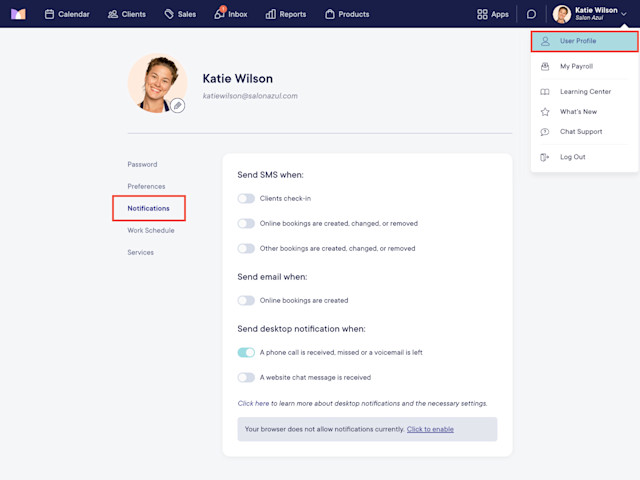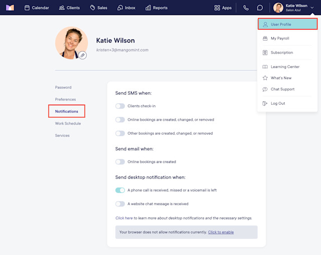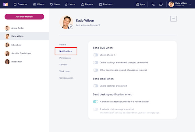 Staff members can receive text, email, push, and desktop notifications when different events occur, including new online bookings and new web chat messages. Text and email notifications will be sent to the phone number and email address in the staff member’s profile.