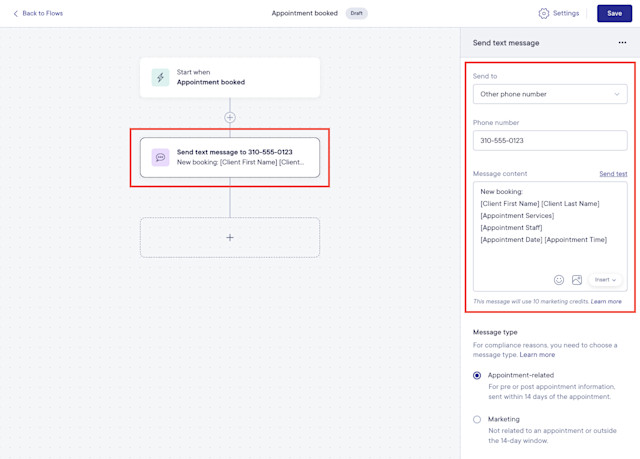 Enable an email or text message by creating an automated flow using the Appointment booked trigger. You can send an email or text message to a specific email address or phone number.