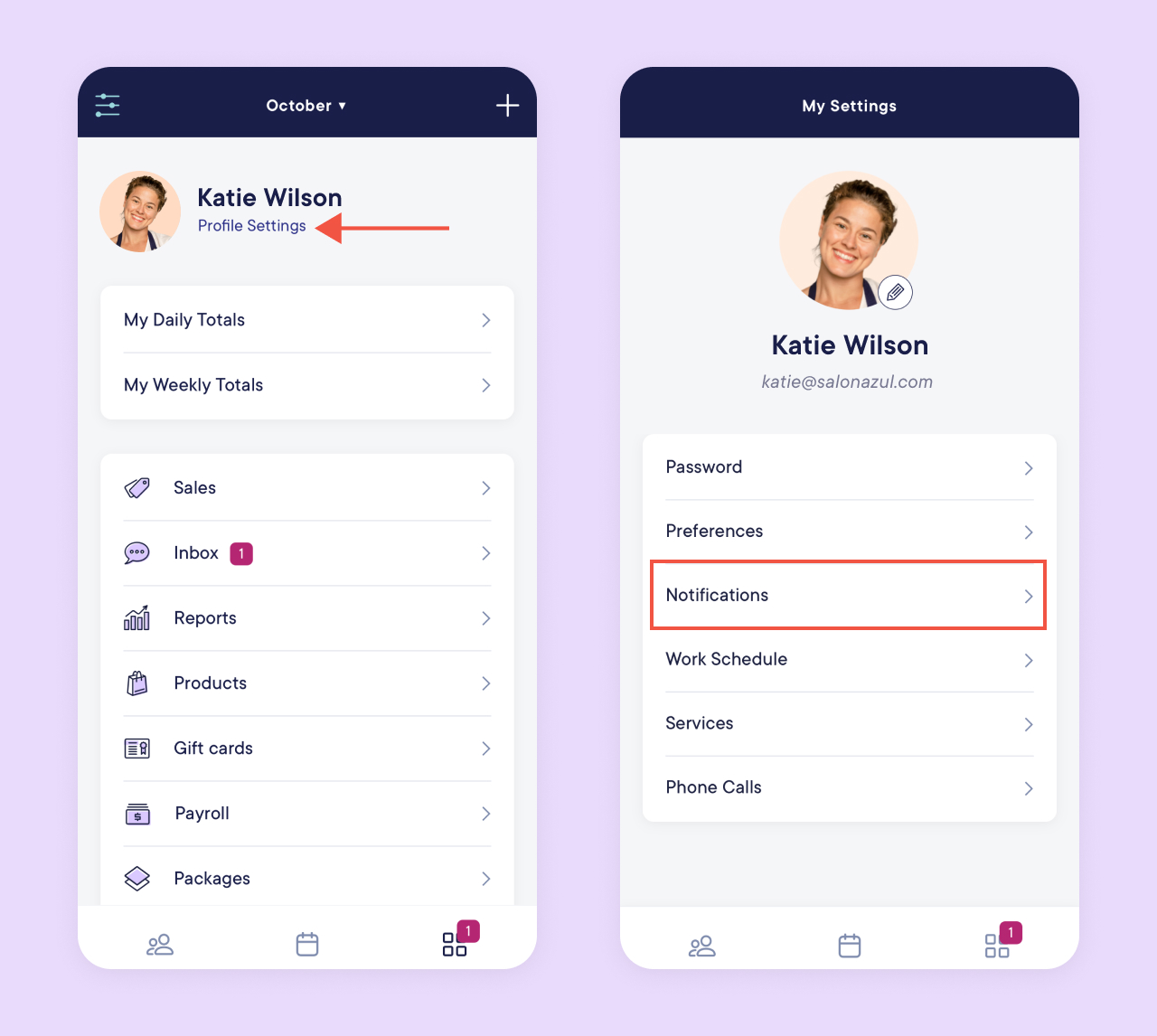To update notification preferences, open the Staff Members app and select the Notifications tab.