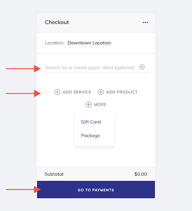 Use the Add Service, Add Product, and More buttons to add services, products, gift cards, or packages to the checkout. Learn how to use a barcode scanner to scan products during checkout.