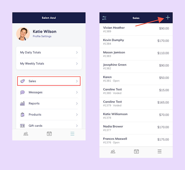 To complete a checkout without an appointment, open the Sales app and select New Checkout. In the mobile app, open the menu, tap Sales, and tap the "+" button.