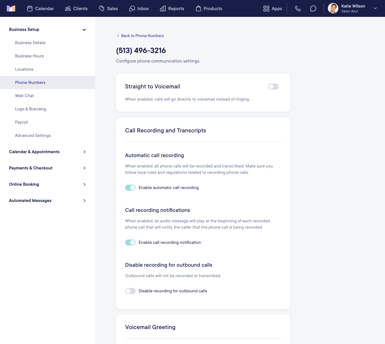After enabling phone calls, you can update phone and voicemail settings by opening the Settings app and going to Business Setup > Phone Numbers > Manage settings.