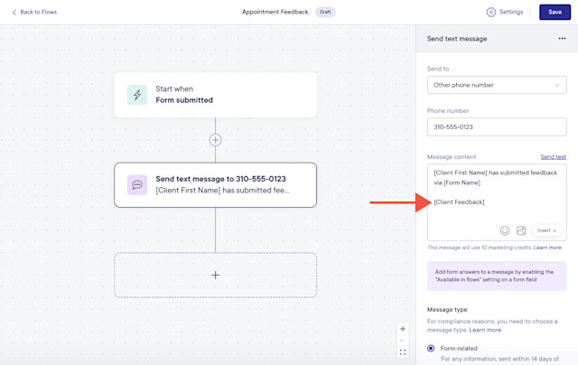 Include form responses in messages: Include a form response in a flow message by using a merge tag. For example, if a client submits feedback on a form, send the feedback to an internal email address.