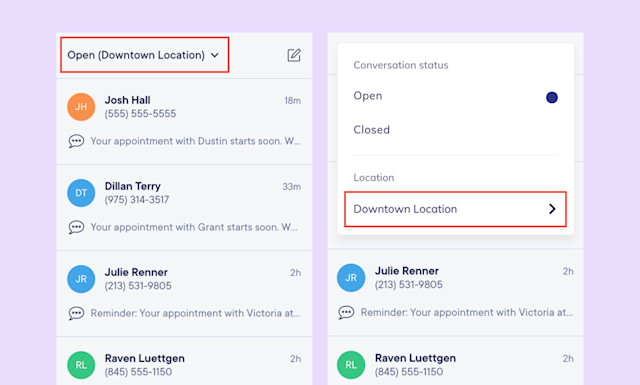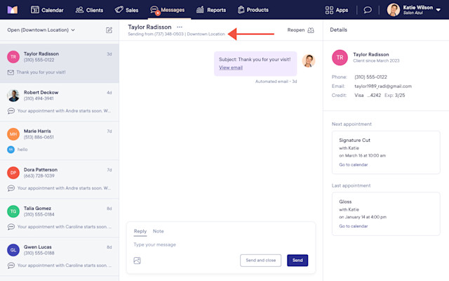 When viewing conversations for all locations in the Messages app, the same client may appear multiple times in the conversation list. This is because the client has conversations with multiple locations that are assigned different phone numbers.