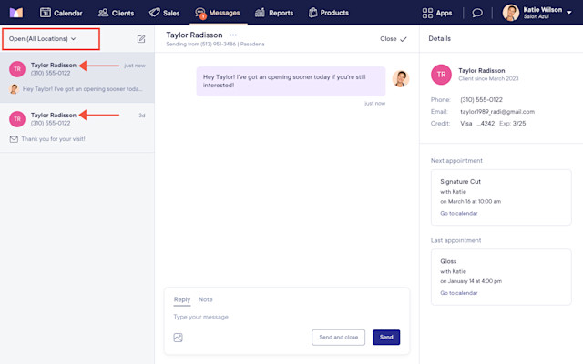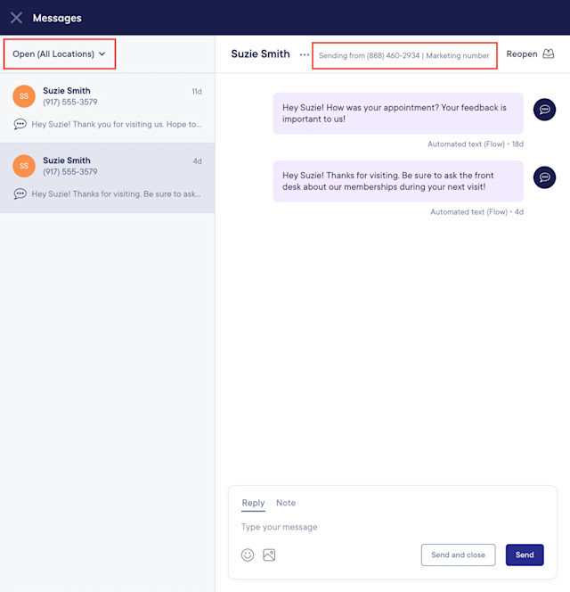 In the client details, you can view a client’s conversations across locations. You can select All Locations to see if the client has received flow text messages from your marketing phone number.