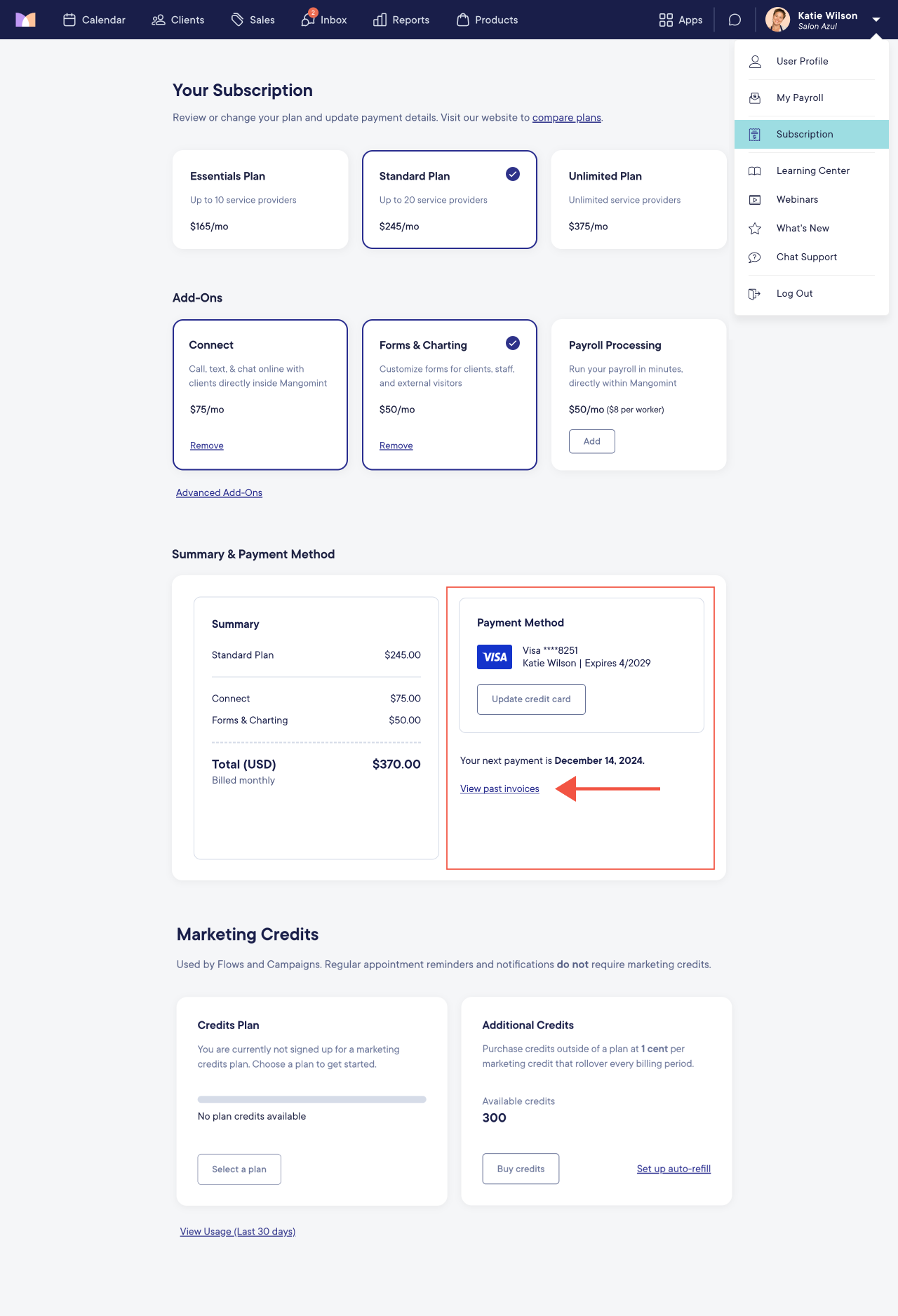 To view the invoices for your Mangomint subscription, select Subscription from your profile menu.