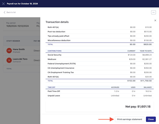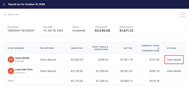 To download a worker’s paystub when viewing a past payroll run, select View details next to the worker and select Print earnings statement.