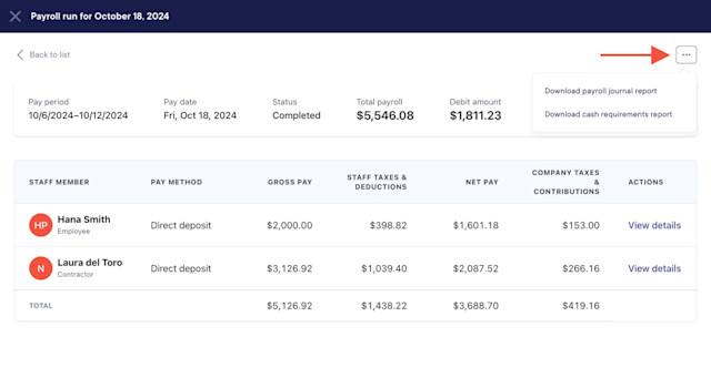To download the Payroll Journal or Cash Requirements reports for a specific payroll run, select the History tab. Select View details next to the payroll run and download the reports from the "..." menu.