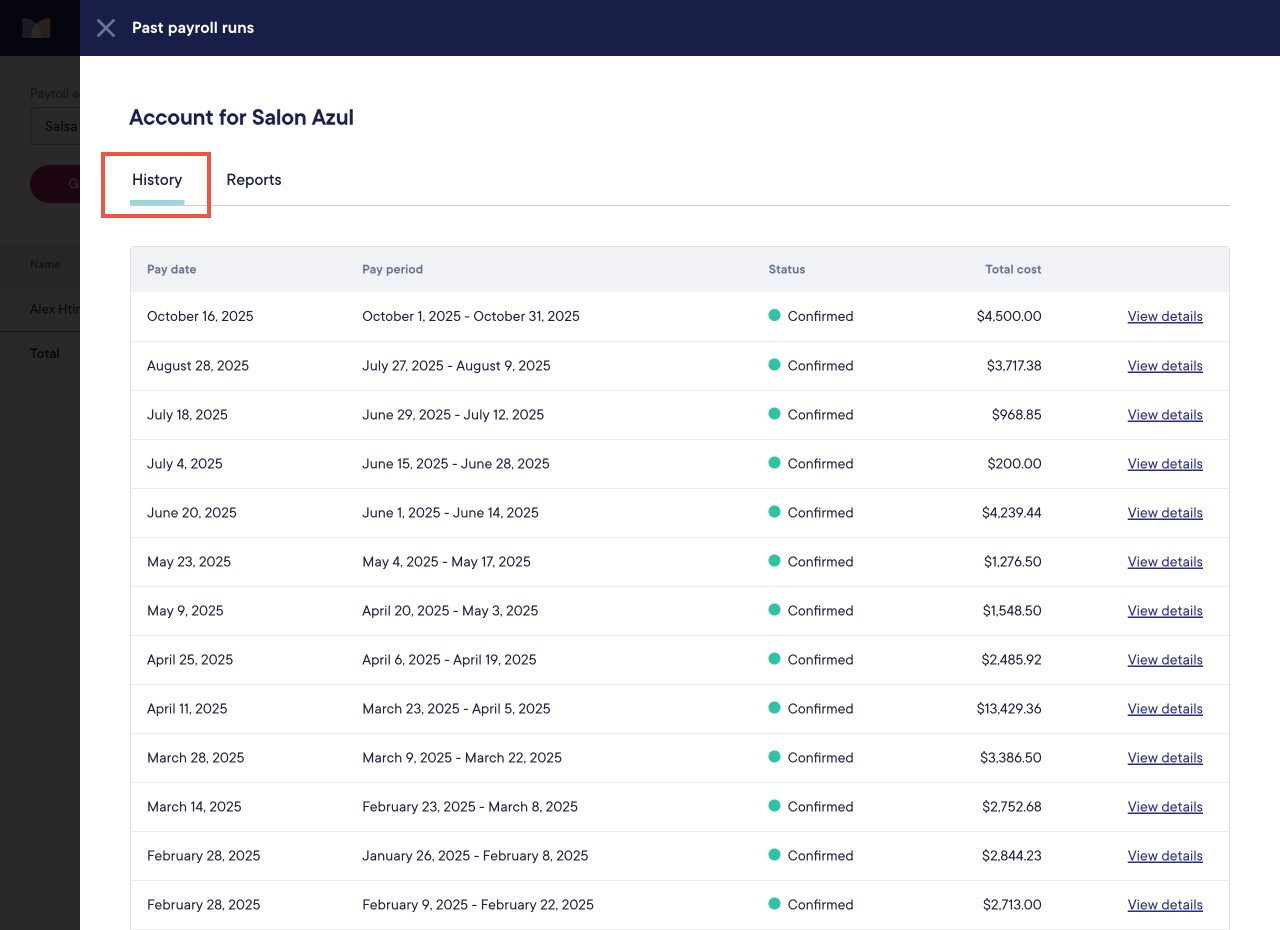 To download the Payroll Journal or Cash Requirements reports for a specific payroll run, select the History tab. Select View details next to the payroll run and download the reports from the "..." menu.