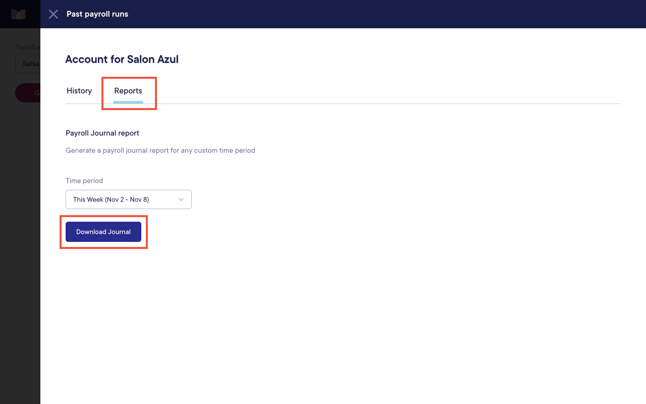 To download the Payroll Journal report by quarter, year, or a custom date range, select the Reports tab. Specify the time period and select Download Journal.