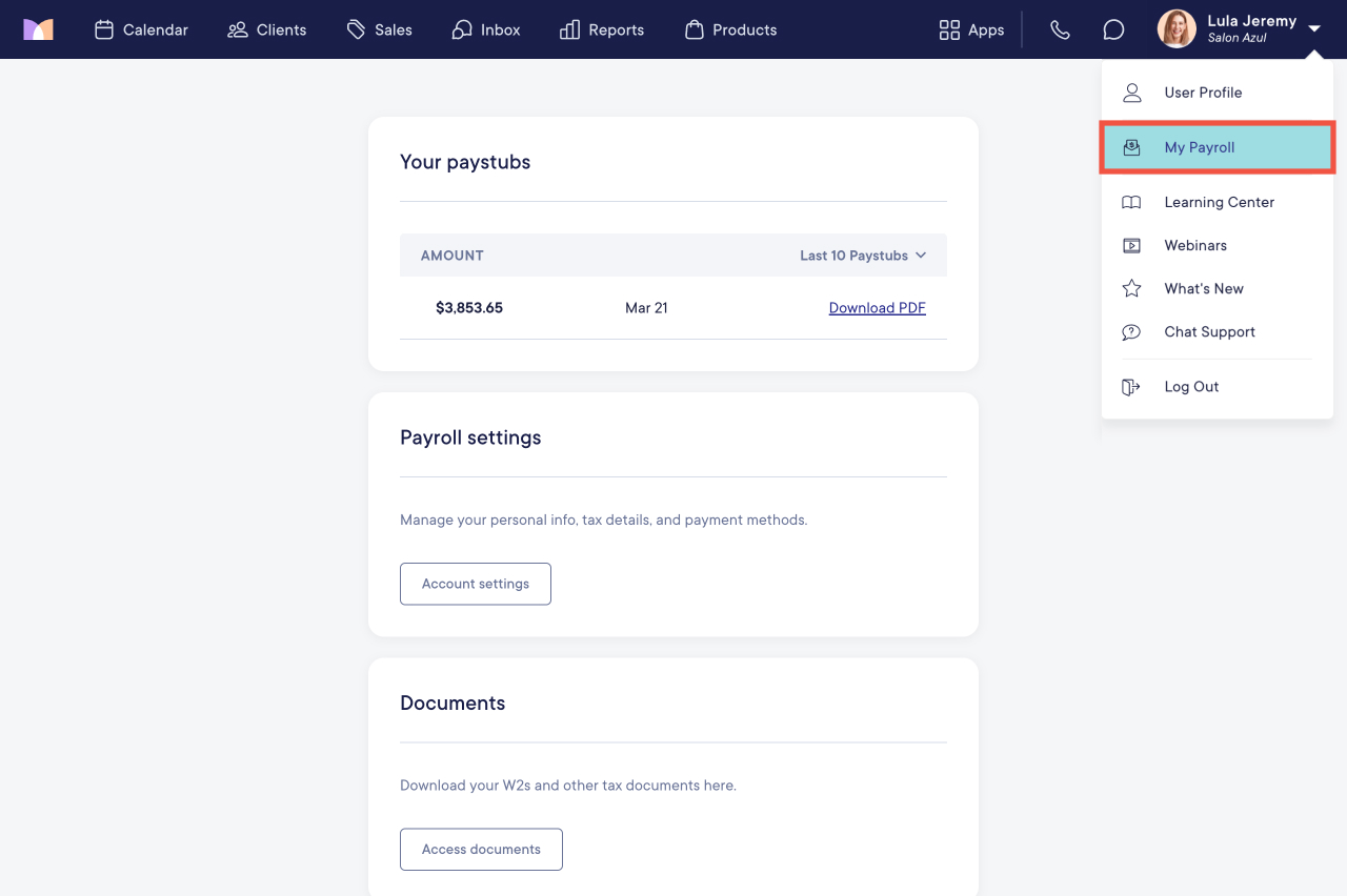 As a worker who has been paid through Mangomint, you can view and download your paystubs and year-end tax documents (W-2 or 1099-NEC) in Mangomint by selecting My Payroll from your profile menu.