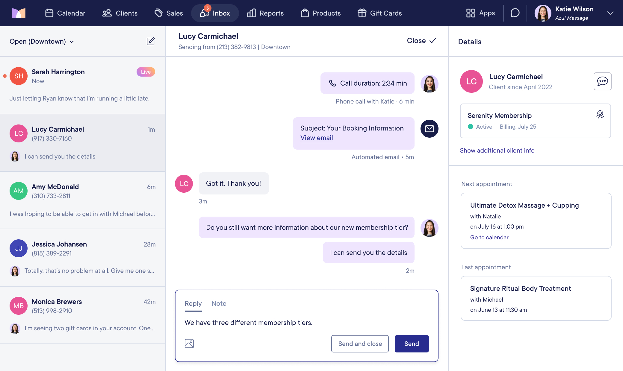 Create highly personalized sequences of emails and text messages to rebook clients, welcome first-time guests, encourage reviews, and upsell memberships.