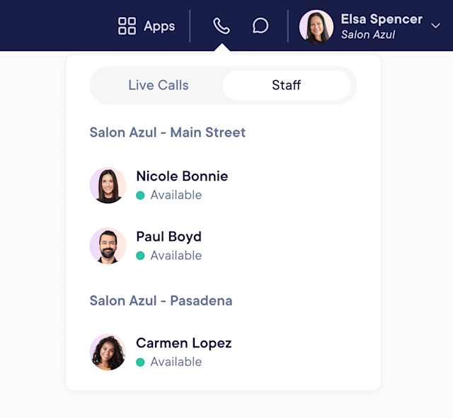 Previously, you could only view your staff members' availability status in your Settings. Now, staff members who have devices enabled to receive incoming calls will appear in the Phone Call dropdown menu—accessible through the Phone Call icon in the navigation bar.
