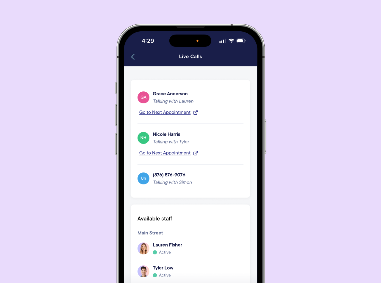 When you tap on Live Calls, you will see a list of all live phone calls. If the client on the phone has an appointment scheduled, you can easily jump to that appointment by tapping on Go to Next Appointment.